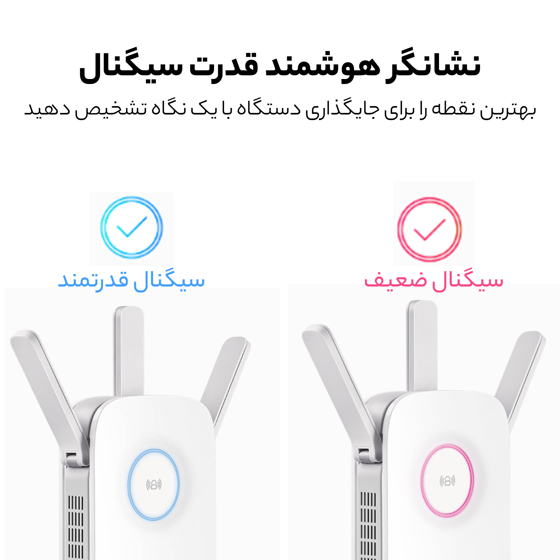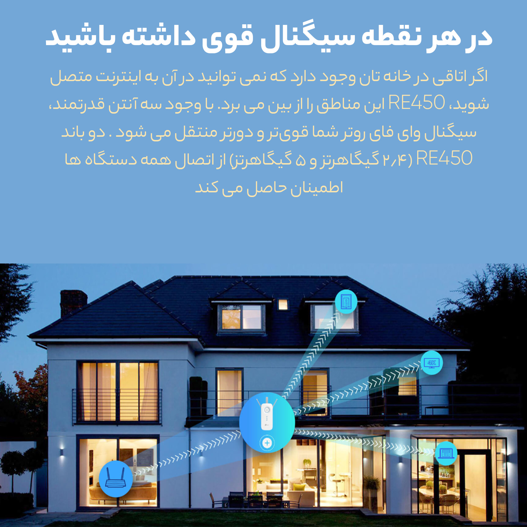 تقویت کننده شبکه بیسیم تی پی لینک TP-LINK مدل RE450 با نصب آسان آنتن دهی مودم ها را افزایش میدهد. در واقع در مکان هایی که آنتن دهی مودم ضعیف است و کل فضا را پوشش نمیدهد فقط با نصب دستگاه Wi-Fi Range Extender آنتن دهی را تقویت کنید بدون نیاز به تعویض مودم و با حداقل هزینه. این دستگاه فقط با اتصال به پریز برق کار میکند و از سیمکشی برق موجود در ساختمان برای انتقال اطلاعات استفاده میکند.