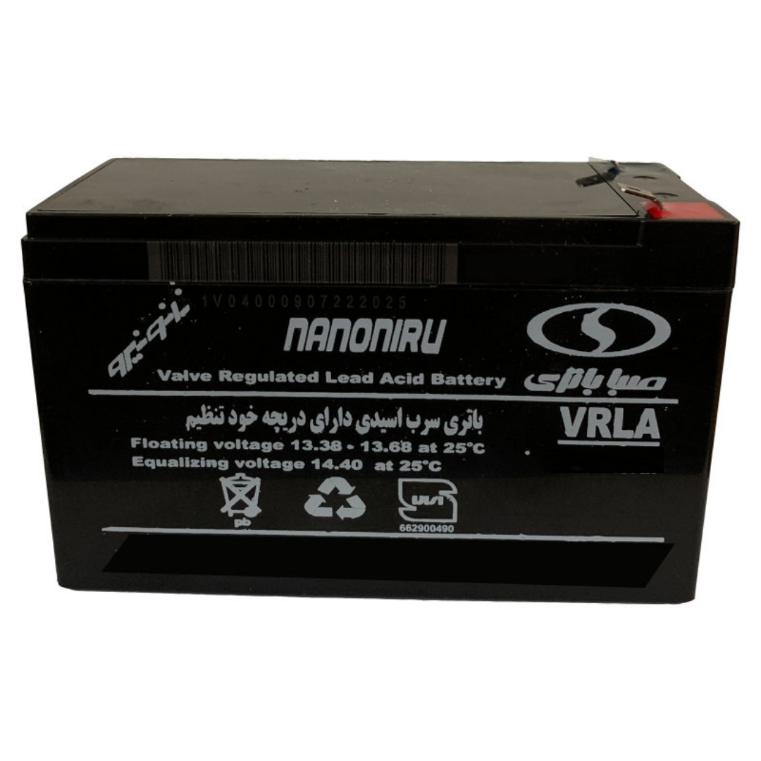 باتری خشک سیلد اسید 12 ولت 9 آمپر صبا باتری نانو نیرو باتری های سیلد اسید قطب مثبت باتری شان از اکسید سرب که به آن آند نیز می گویند و قطب منفی را کاتد می گویند و الکترولیت این باتری از اسید سولفوریک و آب تشکیل شده است.اسید سولفوریک که در باتری های سرب اسید استفاده می شود معمولا 25 الی 40 درصد از محلول داخل را تشکیل می دهند. باتری 12 ولت 9 آمپر از باتری های پر مصرف به حساب می آید, که بیشترین مصرف آن در زمینه یو پی اس و ویلچر های برقی می باشد. کاربرد مصرفی باتری 12 ولت 9 آمپر صبا باتری در سیستم های اعلام حریق ، باتری ویلچر برقی ، باتری یو پی اس ، باتری خورشیدی (سولار) ، باتری سانترال ، باتری سیستم های مخابراتی و ماشین شارژی می باشد. تاریخ این باتری کاملا به روز می باشد . ابعاد باتری طول 16 سانتی متر عرض 7 سانتی متر و ارتفاع 10 سانتی متر میباشد. همچنین وزن این باتری 2800 گرم میباشد