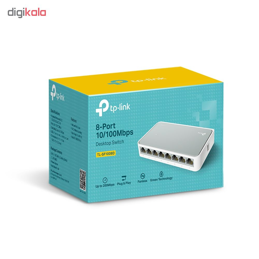 سوییچ «TL-SF1008D Ver 12.0» محصولی از برند «تی پی-لینک» (TP-LINK) است. این سوییچ دارای 8 پورت LAN است و میتواند برای گسترش شبکه و متصلکردن تعداد بیشتری از کاربران به آن مورد استفاده قرار بگیرد. پورتهای LAN بهکاررفته در TL-SF1008D Ver 12.0 از نوع 10/100 مگابیتی هستند که این سوییچ را به انتخاب مناسبی برای شبکههای خانگی تبدیل میکنند. تمام پورتهای LAN به قابلیت Auto MDI/MDIX مجهز هستند و میتوانید از هر نوع کابل مجهز به سوکت RJ45 روی آنها استفاده کنید. با استفاده از چنین سوییچی میتوانید کامپیوتر دسکتاپ و لپتاپ، کنسول بازی خانگی، ذخیرهساز NAS و دوربینهای نظارتی منزلتان را به شبکه وصل کنید. ظرفیت سوییچینگ در این محصول 1.6 گیگابیت بر ثانیه است و پهنای باند انتقال داده شده، در حالت استفاده، از Full Duplex Mode تا 200 مگابیت بر ثانیه خواهد رسید. LED نشاندهندهی روشنبودن سوییچ، در قسمت بالای بدنه تعبیه شده LED های نشاندهندهی فعالیت هر پورت، روی همان پورت قرار گرفتهاند. برق مورد نیاز سوییچ TL-SF1008D Ver 12.0، توسط آداپتور خارجی تامین میشود و با استفاده از Green Technology بهکاررفته درون سوییچ، میزان مصرف برق در آن بسیار ناچیز است.