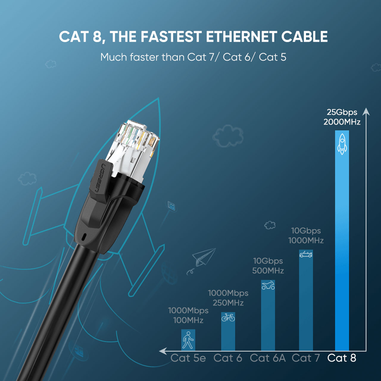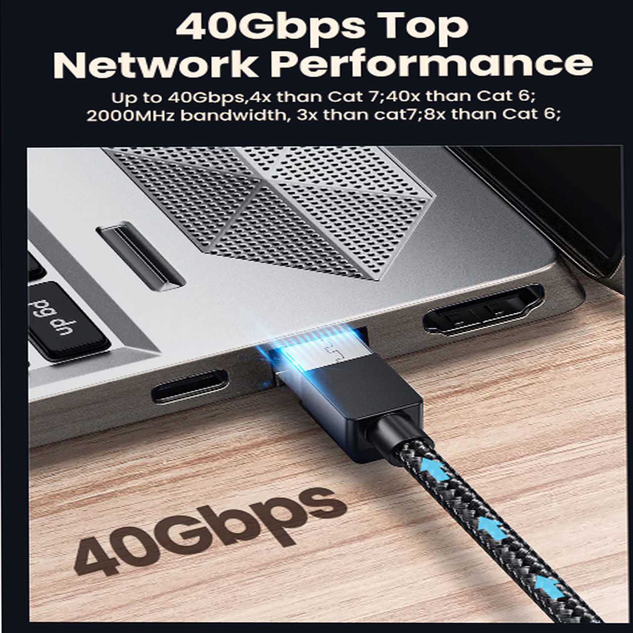 کابل شبکه CAT8 SFTP Ugreen با داشتن کابل ضخیم و آلیاژ تمام مس و سر سوکت فلزی سر طلایی ، قابلیت پشتبانی از فرکانس 2000MHZ و انتقال اطلاعات تا 40Gbps را دارد. از کابل پچ کورد یوگرین CAT8 برای ارتباط بین کامپیوتر و مودم ، سوییچ های گیگا بیتی ، پچ پنل ها و … استفاده می شود.