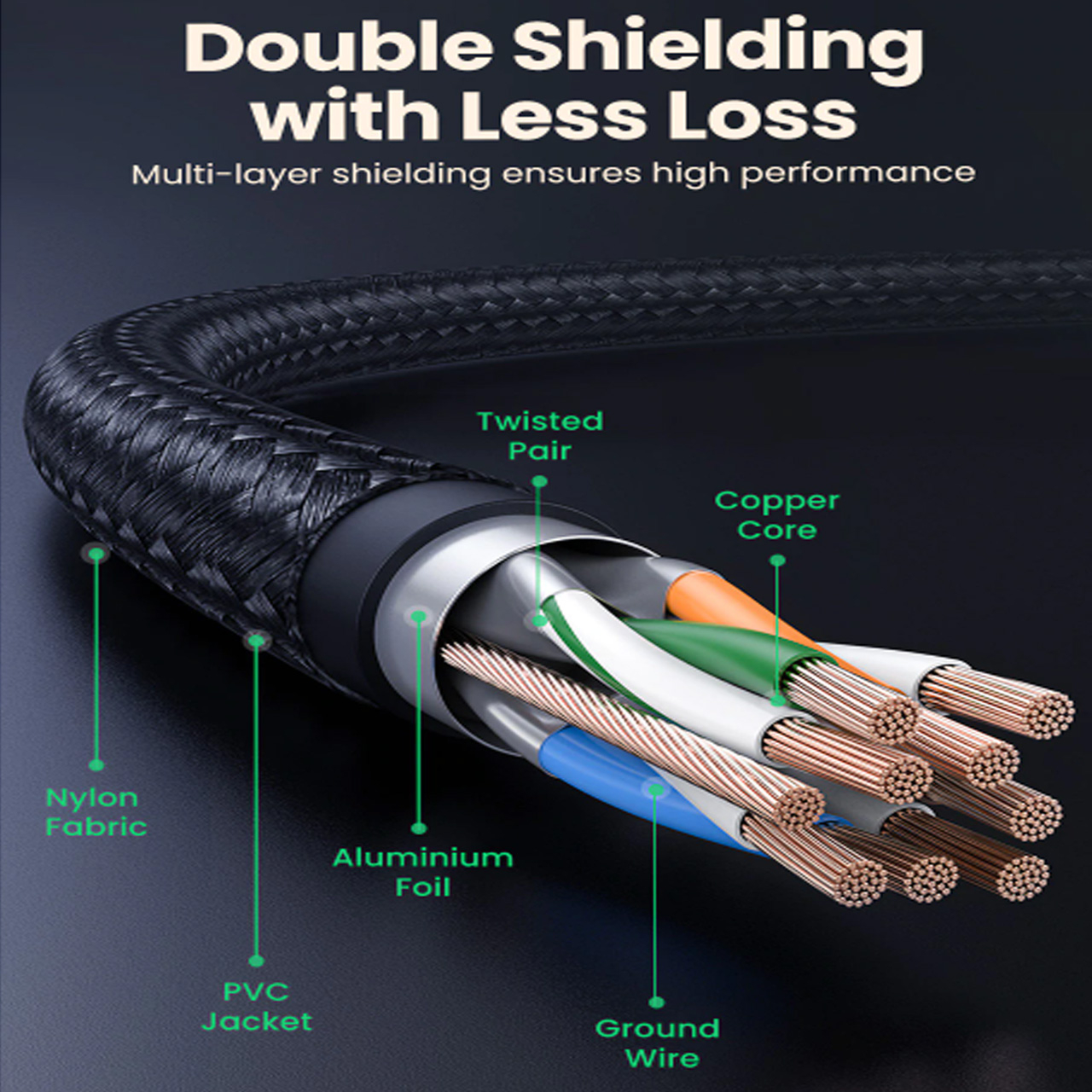 کابل شبکه CAT8 SFTP Ugreen دارای شیلد و فویل جفتی و دارای آلیاژ 100 درصد مس می باشد.